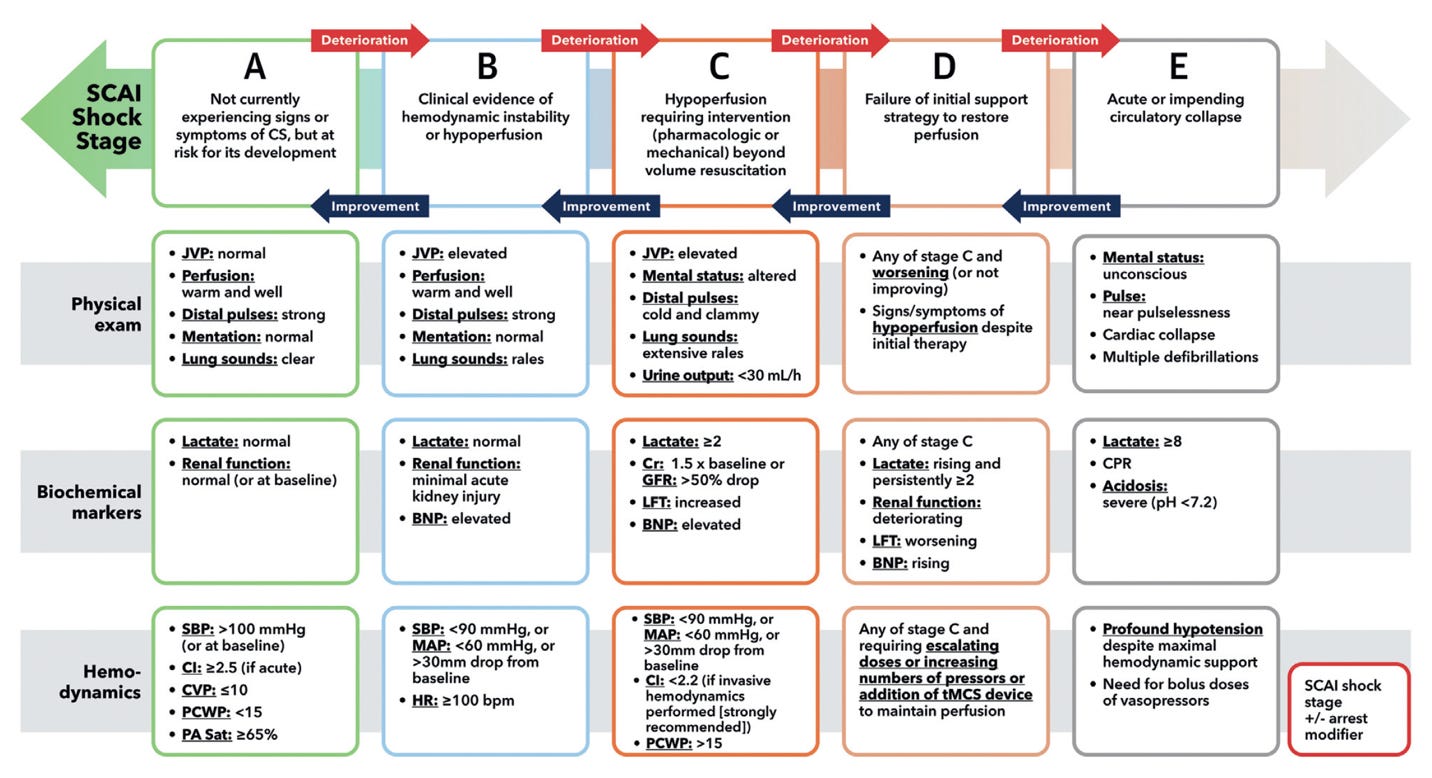 - Naidu SS, Baran DA, Jentzer JC, et al. SCAI SHOCK Stage Classification Expert Consensus Update: A Review and Incorporation of Validation Studies: This statement was endorsed by the American College of Cardiology (ACC), American College of Emergency Physicians (ACEP), American Heart Association (AHA), European Society of Cardiology (ESC) Association for Acute Cardiovascular Care (ACVC), International Society for Heart and Lung Transplantation (ISHLT), Society of Critical Care Medicine (SCCM), and Society of Thoracic Surgeons (STS) in December 2021. J Am Coll Cardiol. 2022 Mar 8;79(9):933-946. doi: 10.1016/j.jacc.2022.01.018. Epub 2022 Jan 31. PMID: 35115207.