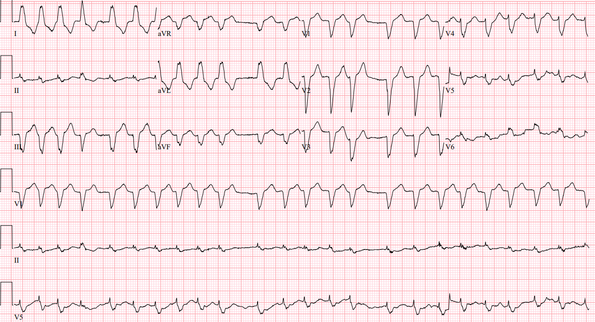 Intervals: no PR interval, widened QRS, QTc looks ok